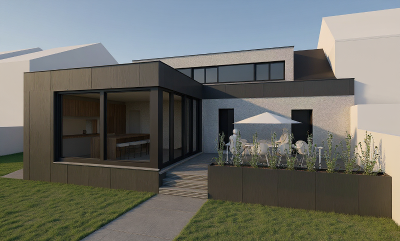 - Une extension contemporaine accueillera la cuisine et la salle à manger, véritables cœurs de la maison.